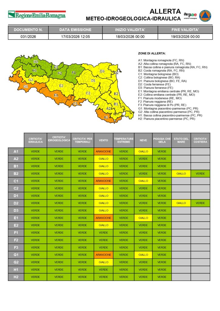 Il Comune di Toano informa la cittadinanza che per la giornata di mercoledì 18 marzo è stata diramata l’allerta meteo n. 031/2026, valida dalle ore 00:00 alle ore 24:00, che interessa anche il nostro territorio.