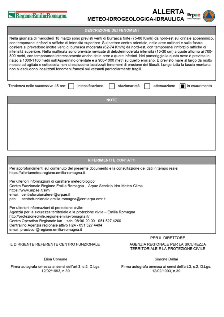 Per aggiornamenti si invita a consultare i canali ufficiali della Regione Emilia-Romagna e della Protezione Civile.