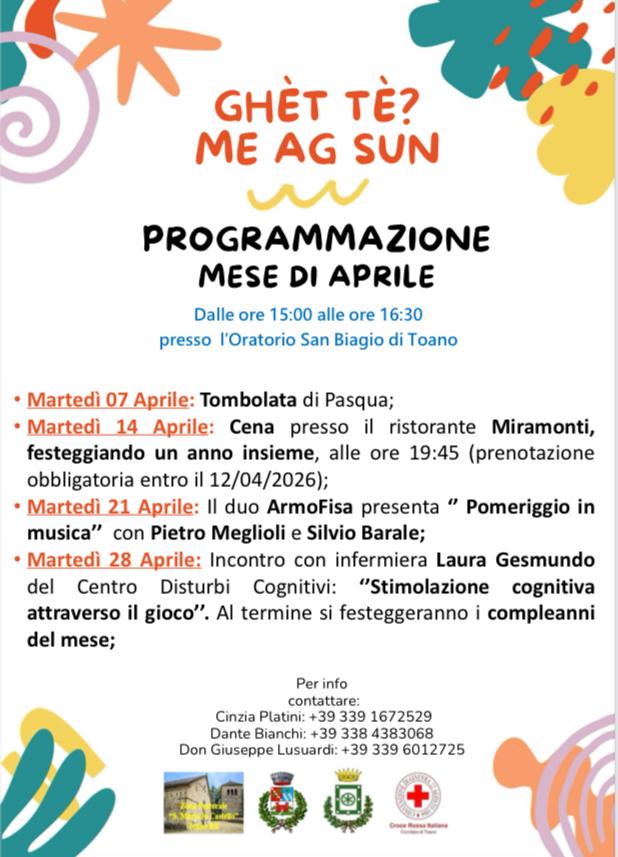 Poi a seguire, per il mese di aprile è stato definito un nuovo calendario di appuntamenti, in programma ogni martedì dalle ore 15 alle 16.30 presso l’Oratorio San Biagio.