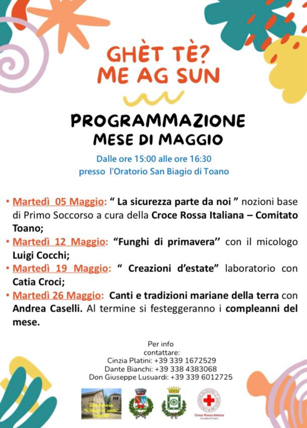 - A chiudere il mese, martedì 26 maggio, un pomeriggio dedicato ai canti e alle tradizioni mariane della terra con Andrea Caselli; al termine, come di consueto, verranno festeggiati i compleanni del mese.